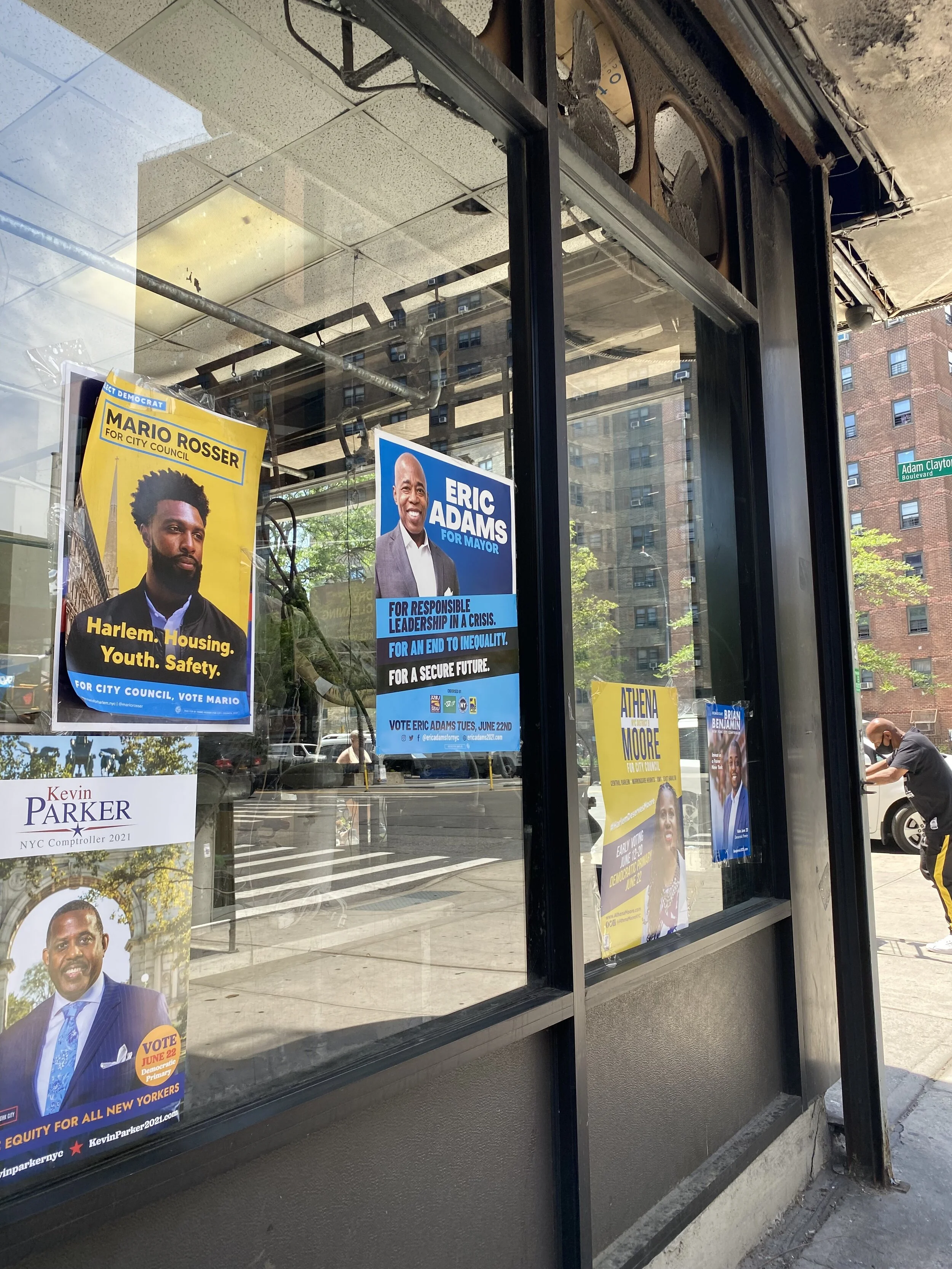 sights, signs of newness: two nannies with four kids each; burkas in the heat; a business call in a suit; a very stylish little person; a woman smoking next to her oxygen tank; a gal rocking out on the back of a motorcycle; daylight street artists; children getting out from school; jacob h schiff school; grandpas relaxing on folding chairs in the sidewalk; a car chase… a man in a jersey running; peaceful harmonica tunes; a mail carrier on his phone; a chess match outside a corner store; sweaty asphalt; african oils; a free covid testing truck; a sign for 25 cent candy; a man cutting cantaloupe; campaign signs, seemingly reflecting changes in demographics around the city; timbuktu islamic center; ‘hi baby how are you’; a babe in a stroller, eyes closed, mouth around a bottle; two women in rollers; a man eating a slice of watermelon while driving; marcus garvey park; a little girl carrying a paper mâché owl; ‘más amor por favor’; shadows, leaves, movement; mount sinai white coats; q mart, a deli in the front with korean food in the back; blue striped shirt red bow tie tan suit and hat; jewish black hats and beards; a woman pushing a stroller eating an apple; a squealing child; gorgeous unaffordable dresses; a sign outside a store, no masks required if you are vaccinated; a very joyful trombonist.