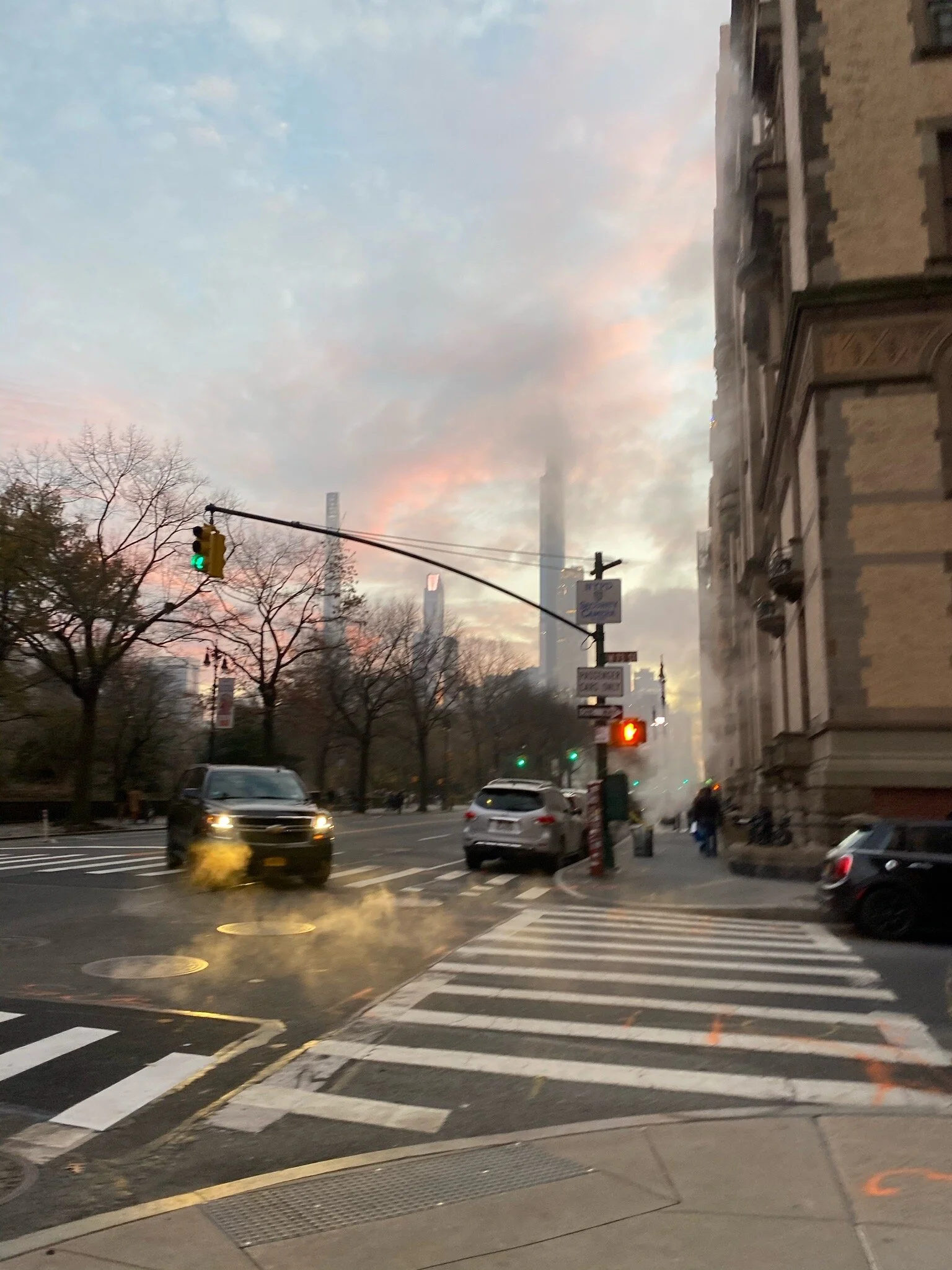 here are the sights from that foggy walk: flip flops; a man doing a wheelie; white hair not an old person; a woman on the phone with her mom, ‘oh my gosh i didn’t tell you?’; a mailman singing a tune; a drunk man staggering on the sidewalk; lone asian street vendors selling masks of all designs; a protest or a rally; a vibrantly colored hair salon; a father teaching his son how to play basketball; an empty art gallery; langston hughes playground; a young couple hugging tenderly on a street corner; a man and his dog sitting on a hill in central park; a baby in a teddy onesie; the most elegant man dressed in a white fedora and white suit; instagram modelling outside the natural history museum; a really magnificent black velvet dress; street lights flickering on one by one down the street, enchanting; doormen with their gold-embellished uniforms and signature caps; pine leaves and pinecones tucked into the little tree boxes, invisible workers bringing christmas cheer; abe and fred (below); sweet blushing baby cheeks.