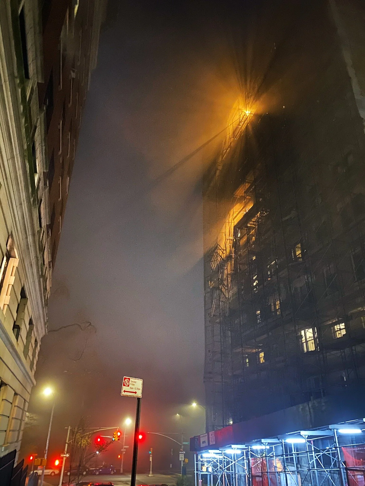 it was dark when i got off the subway, as it always is during this season. for the past few months living in this apartment, construction on the building next to ours has on many occasions made me want to scream out the window. i wasn’t trying to find silver linings, but this moment, this photograph, left me standing on the sidewalk for a full minute. a lighthouse in the city. one other person walking, then gone. the scaffolding splitting the amber beam. the primary colors! red, blue, and yellow illuminating the thick mist.