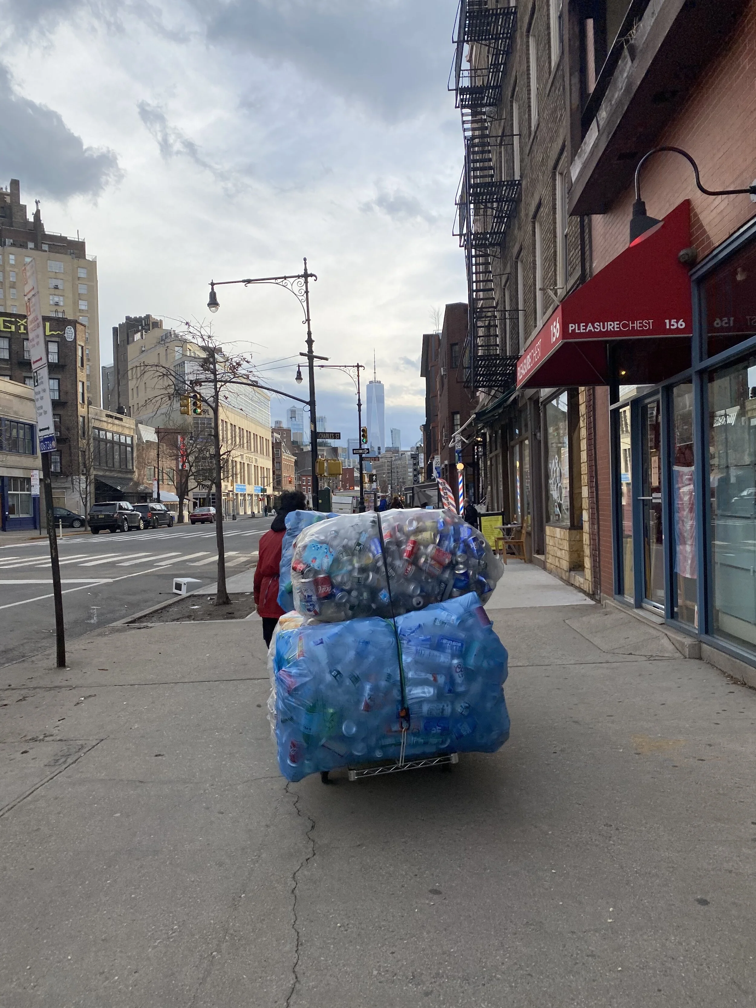i passed right through times square with little feeling. the streets were recognizable today as i’ve been around this area the past couple of walks. i passed small’s, and was struck by excitement/apprehension as it appeared open, but then realized that while performers were there, the audience was on the screen. i watched a woman carrying bags upon bags of aluminum cans and plastic bottles, perilously yet perfectly balanced, world trade center visible in the distance.